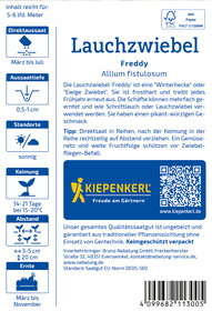 Die Lauchzwiebel 'Freddy', oft auch als "Winterhecke" oder "Ewige Zwiebel" bezeichnet, begeistert durch ihre Frosthärte und die Fähigkeit, jedes Frühjahr erneut auszutreiben. Diese robuste Sorte ist eine hervorragende Wahl für Ihren Garten, da sie langfristig gedeiht und Ihnen über viele Monate frische Ernten beschert. Genießen Sie die pikant-würzigen Schäfte, die sich mehrfach ernten lassen. Setzen Sie die 'Freddy' kreativ in Ihrer Küche ein und profitieren Sie von ihrer Vielseitigkeit. Ob als schmackhafter Schnittlauch-Ersatz, in Salaten oder als frische Zutat in vielen Gerichten – diese Lauchzwiebel wird Sie mit ihrem angenehmen Geschmack begeistern und sorgt für eine aromatische Note in Ihren Speisen. Entdecken Sie die Vorteile der 'Freddy' in Ihrem Garten und genießen Sie die frischen Aromen, die sie in Ihre Küche bringt! Genießen Sie Ihre Gartenliebe mit der 'Freddy'!| Kurzbezeichnung : | Lauchzwiebel Freddy |