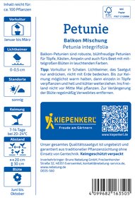 Die Balkon-Petunie ist der perfekte Begleiter für Ihre Garten- und Balkonträume! Mit ihren prachtvollen, bunten Blüten sorgt sie für ein lebhaftes Ambiente in Töpfen und Kästen und erreicht eine Höhe von 30 bis 40 cm. Diese vielseitige Pflanze verwandelt jeden Außenbereich in eine blühende Oase. Lassen Sie sich von der Freude der Balkon-Petunien mitreißen und verzaubern Sie Ihren Balkon oder Ihre Terrasse! Ihre üppigen Blüten bringen Farbe und Lebendigkeit in jede Ecke und machen die warmen Monate noch schöner. Ideal für kreative Arrangements, sorgen die Balkon-Petunien für strahlende Farben und eine fröhliche Atmosphäre, die zum Entspannen und Genießen einlädt. Holen Sie sich die lebhafte Pracht dieser zauberhaften Pflanzen in Ihr Zuhause und erleben Sie den Sommer in voller Blütenfülle! Entdecken Sie die Balkon-Petunie und setzen Sie fröhliche Farben in Ihren Garten!| Kurzbezeichnung : | Petunie Balkon Mischung |