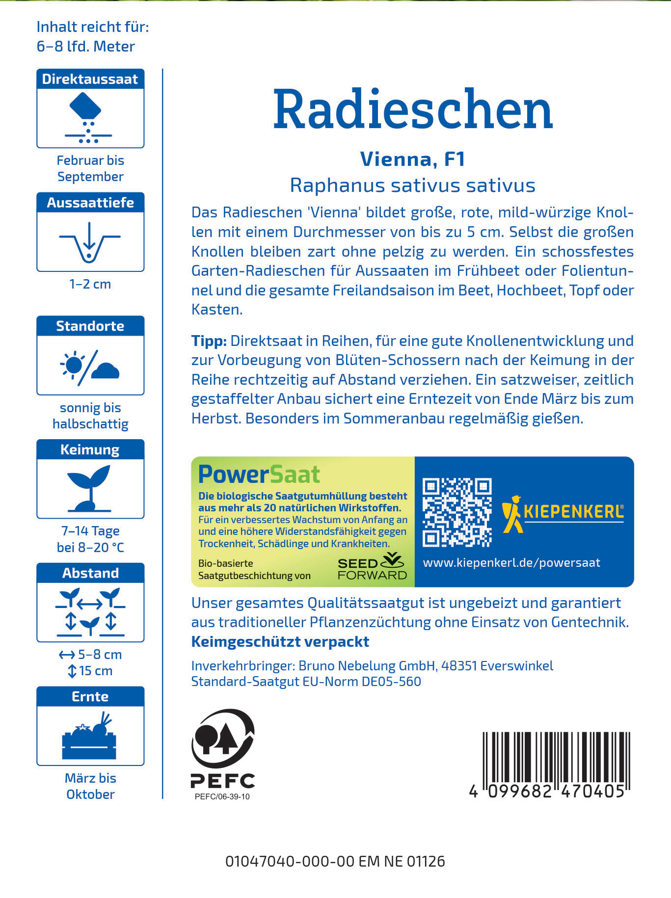 Das Radieschen 'Vienna' erfreut sich großer Beliebtheit aufgrund seiner leuchtend roten Knollen, die bis zu 5 cm groß werden können. Diese Sorte überzeugt durch ihren mild-würzigen Geschmack, der in vielen Gerichten hervorragend zur Geltung kommt. Genießen Sie die knackigen, einladenden Radieschen in Salaten, auf Sandwiches oder einfach als gesunden Snack für zwischendurch. Dank ihrer schossfesten Eigenschaften ist 'Vienna' eine ideale Wahl für den Frühbeet- und Folientunnel-Anbau, während Sie gleichzeitig die gesamte Freilandsaison nutzen können. Sie können diese köstliche Sorte problemlos im Beet, Hochbeet, Topf oder Kasten kultivieren. Egal, ob Sie zum ersten Mal gärtnern oder bereits Erfahrung haben, die Zartheit und der unverwechselbare Geschmack werden Sie zurück in den Garten ziehen und zur Ernte einladen. Gestalten Sie Ihren Garten mit diesem köstlichen Radieschen und genießen Sie knackige Frische!| Kurzbezeichnung : | Radieschen Vienna, F1, PowerSaat |