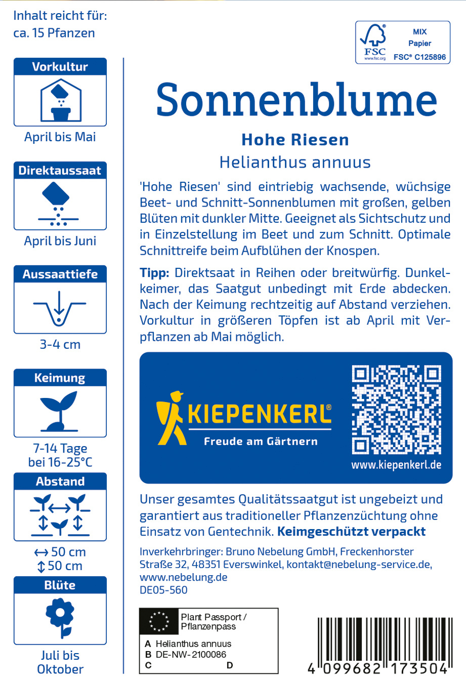 Die Sonnenblume 'Hohe Riesen' erstrahlt mit ihren großblütigen, gelben Blüten und der markanten dunklen Mitte – sie ist eine wahre Augenweide in jedem Garten! Diese eintriebig wachsende, wüchsige Sorte eignet sich hervorragend als Sichtschutz, für die Einzelstellung im Beet und als Schnittblume. Mit beeindruckenden Höhen von 300 bis 400 cm werden sie garantiert zum Blickfang und verleihen Ihrem Außenbereich eine majestätische Ausstrahlung. Erleben Sie die prächtigen Blüten der 'Hohe Riesen' und ernten Sie sie, wenn die Knospen aufblühen – dann entfaltet sie ihre volle Pracht und eignet sich hervorragend für florale Dekorationen. Holen Sie sich mit dieser beeindruckenden Sonnenblume ein Stück Natur und Lebensfreude in Ihren Garten und genießen Sie die sorglose Schönheit, die sie in Ihre grünen Oasen bringt! Lassen Sie die Sonnenblume 'Hohe Riesen' in Ihren Garten einziehen und erfreuen Sie sich an ihrem imposanten Anblick!| Kurzbezeichnung : | Sonnenblume Hohe Riesen |