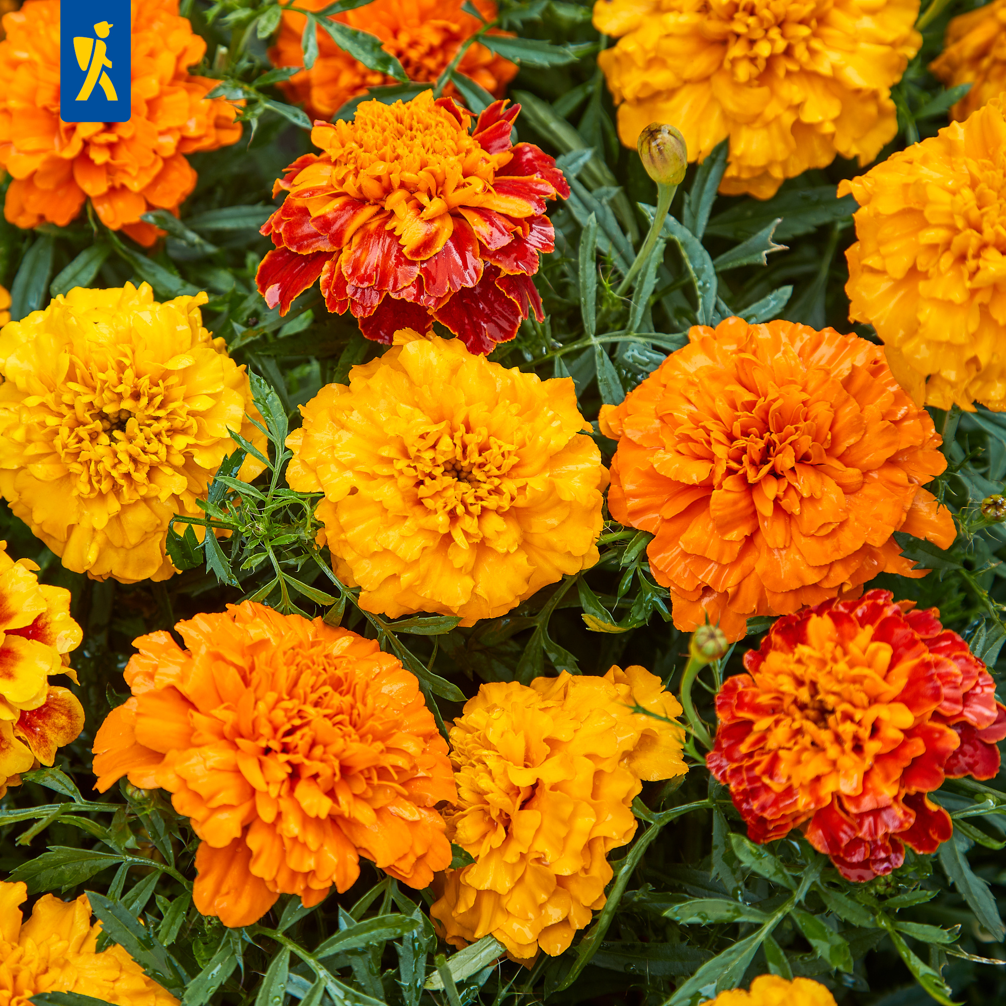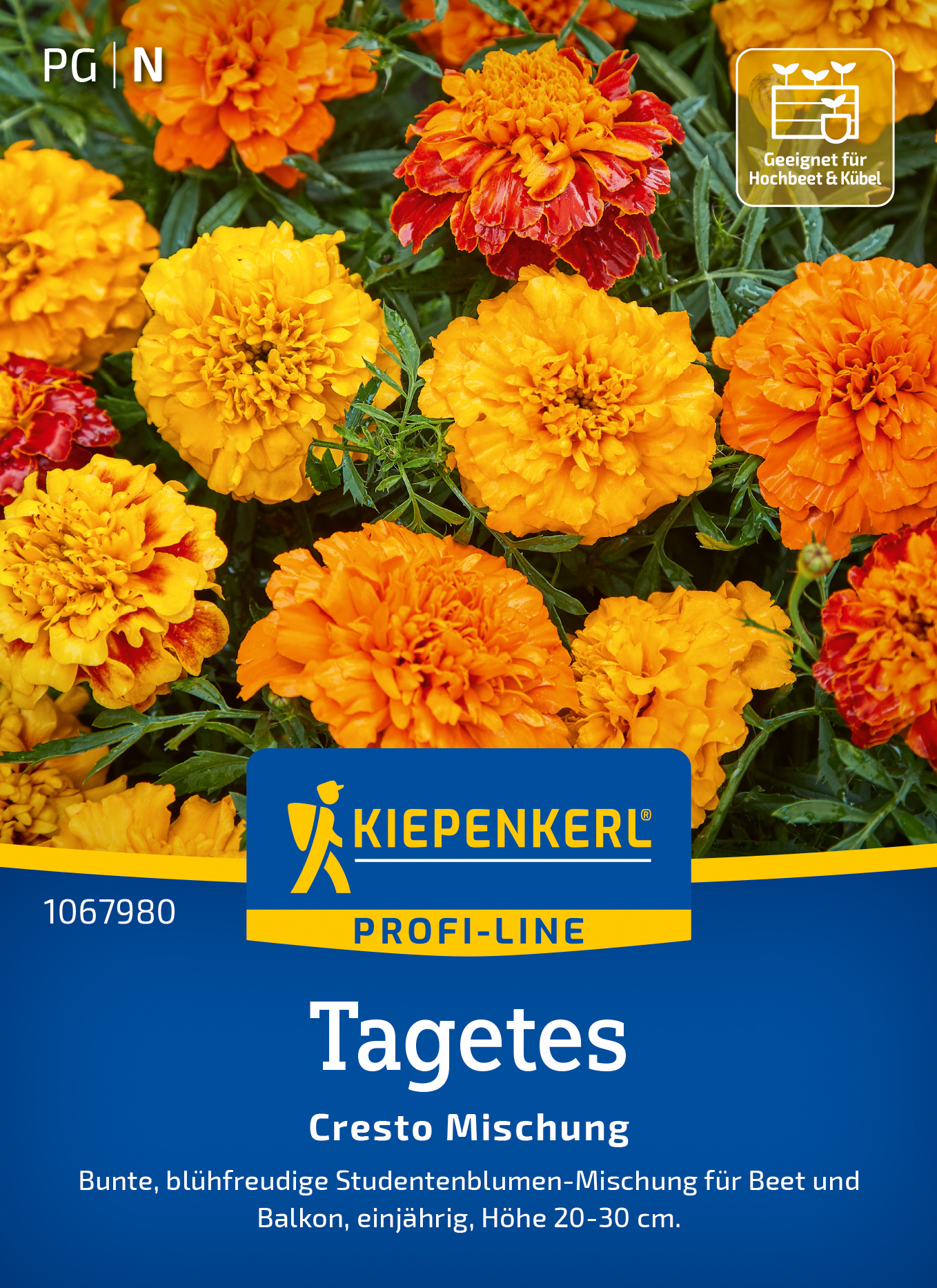 Die Tagetes Cresto Mischung begeistert mit ihren bunten, gefüllten Blüten in warmen Gelb-, Orange-, und Rottönen. Diese einjährige Pflanze blüht unermüdlich und eignet sich sowohl für kleine Gruppen im Beet als auch für Töpfe und Kästen. Die geselligen Blüten sind ein wichtiger Bestandteil für die Bindung von Insekten, die unter anderem auch Nahrungsquellen brauchen. Bereiten Sie sich auf einen farbenfrohen Sommer vor! Nutzen Sie diese robuste Mischung, um eine lebendige und einladende Atmosphäre in Ihrem Garten zu schaffen. Ihre Farben und Düfte werden sowohl Sie als auch Ihre Besucher verzaubern. Erfreuen Sie sich an Farbenpracht mit der 'Cresto' Mischung!| Kurzbezeichnung : | Tagetes Cresto Mischung |